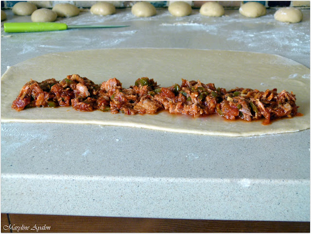 Faire une pate avec 500 gr de farine, 100 gr de sucre, 1/2 cas de sel, 1 cas de levure, 2 oeuf et 1/2 verre d'huile et laisser monter