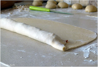 מתחילים מהכדור הראשון: מרדדים אותו למלבן בגודל של כ-15 על 10 ס"מ, מסדרים פס מלית לאורך החלק התחתון של המלבן, בלי לגעת בשוליים. מגלגלים/סוגרים את הבצק על פס המלית, ומהדקים בעזרת האצבעות. חורצים על המלבן חריצים במרווחים שווים, מבלי להגיע לשוליים. מגלגלים את הבצק על עצמו, מעגלים את הגליל לצורת קשת, ומניחים על התבנית כשהתפר כלפי מטה. מכינים כך את שאר הלחמניות.