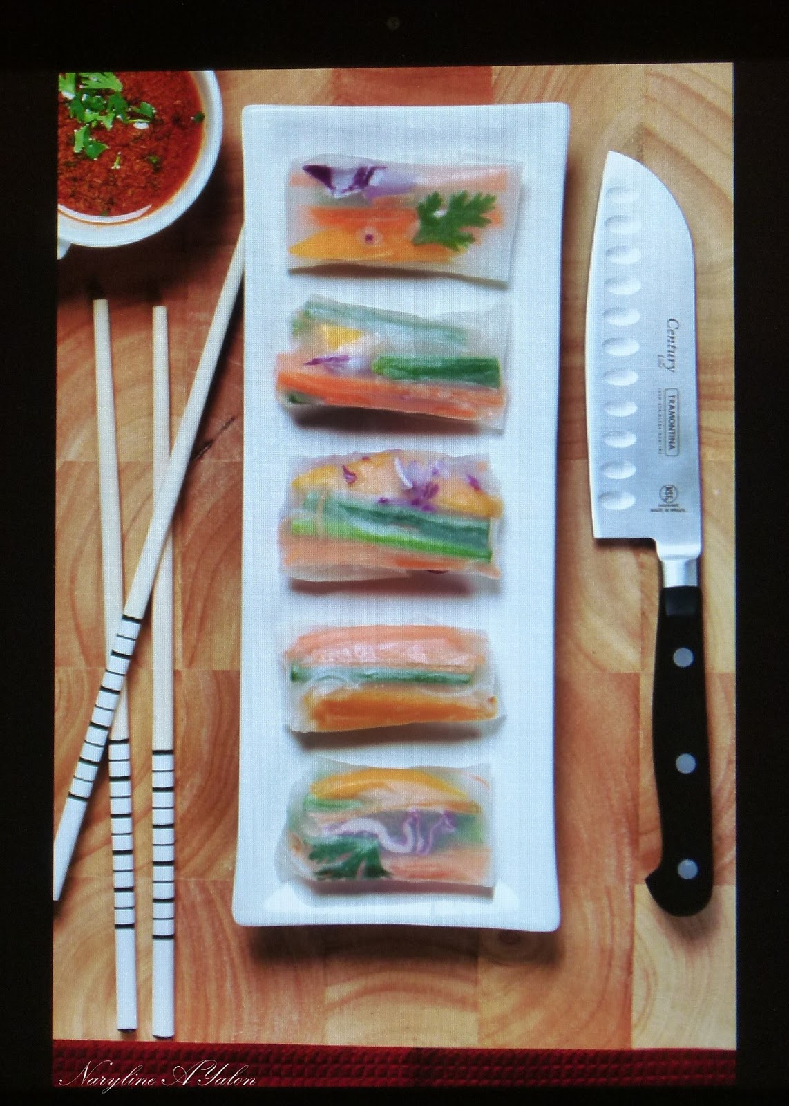 דפים אלו שהיא הביאה לי נתנו את ההשראה למנה שלי, וביום הצילומים רבקה הייתה נוכחת ועזרה לי בגלגול הדפים או יותר נכון לקחה את כל המנה על עצמה ועמדה במטבח מול ערימה של דפים וירקות וגלגלה בחיוך ובדביקות אל מול דרישות הצוות: "קצר יותר! ארוך יותר! דק יותר! עגול יותר! פחות כרוב! יותר גזר! ועוד".